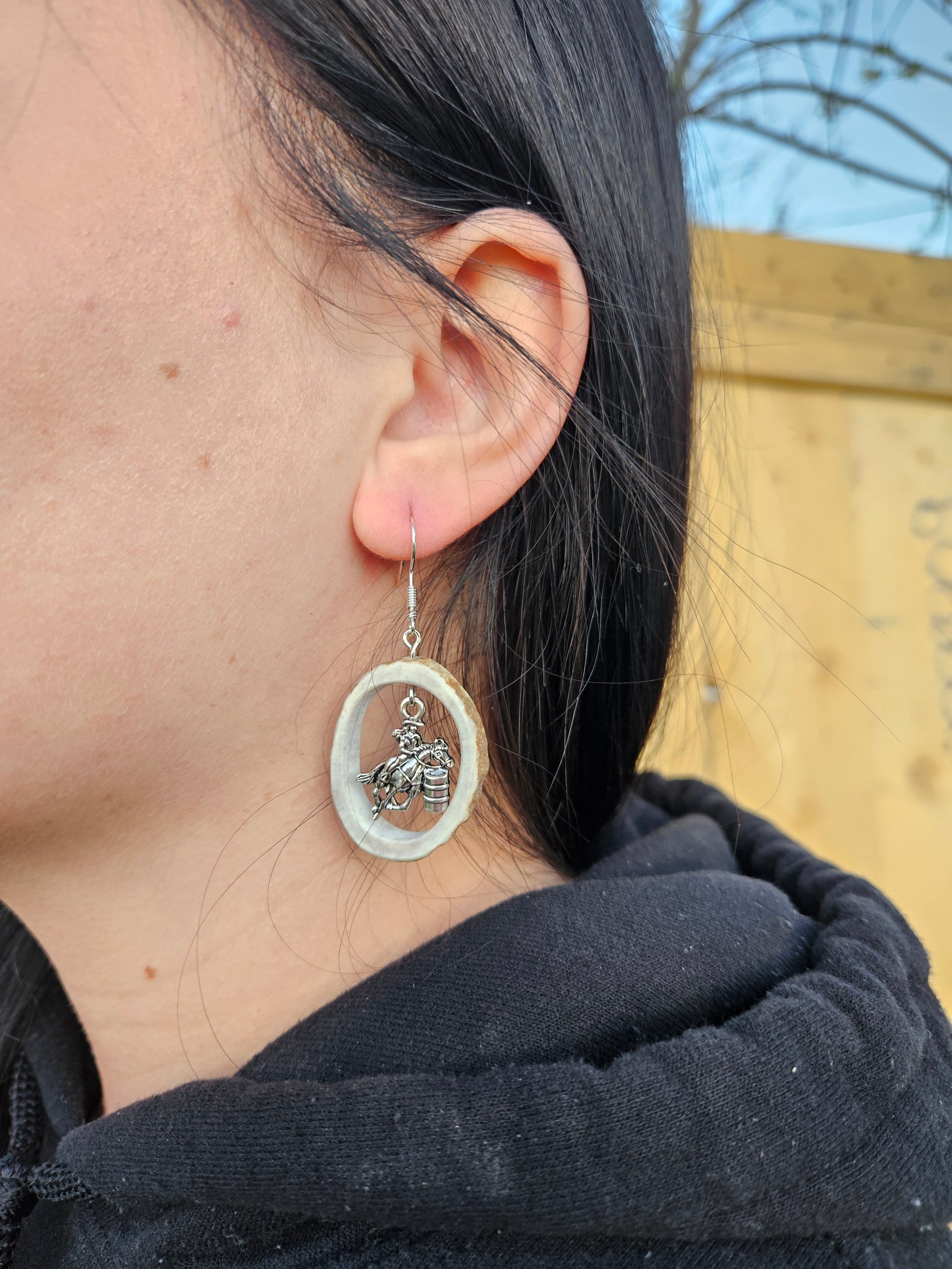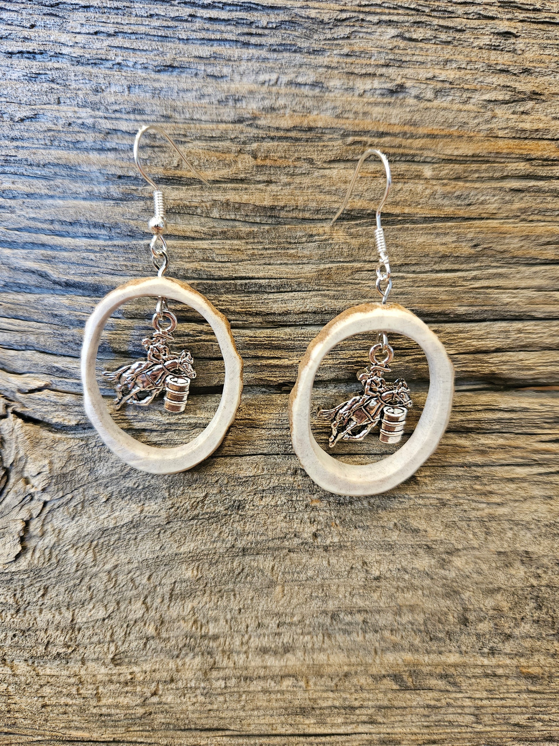 Turn and burn with this slick pair. This style features a silver barrel racer charm inside a hollowed out antler slice and comes with 925 hypo-allergenic hooks.