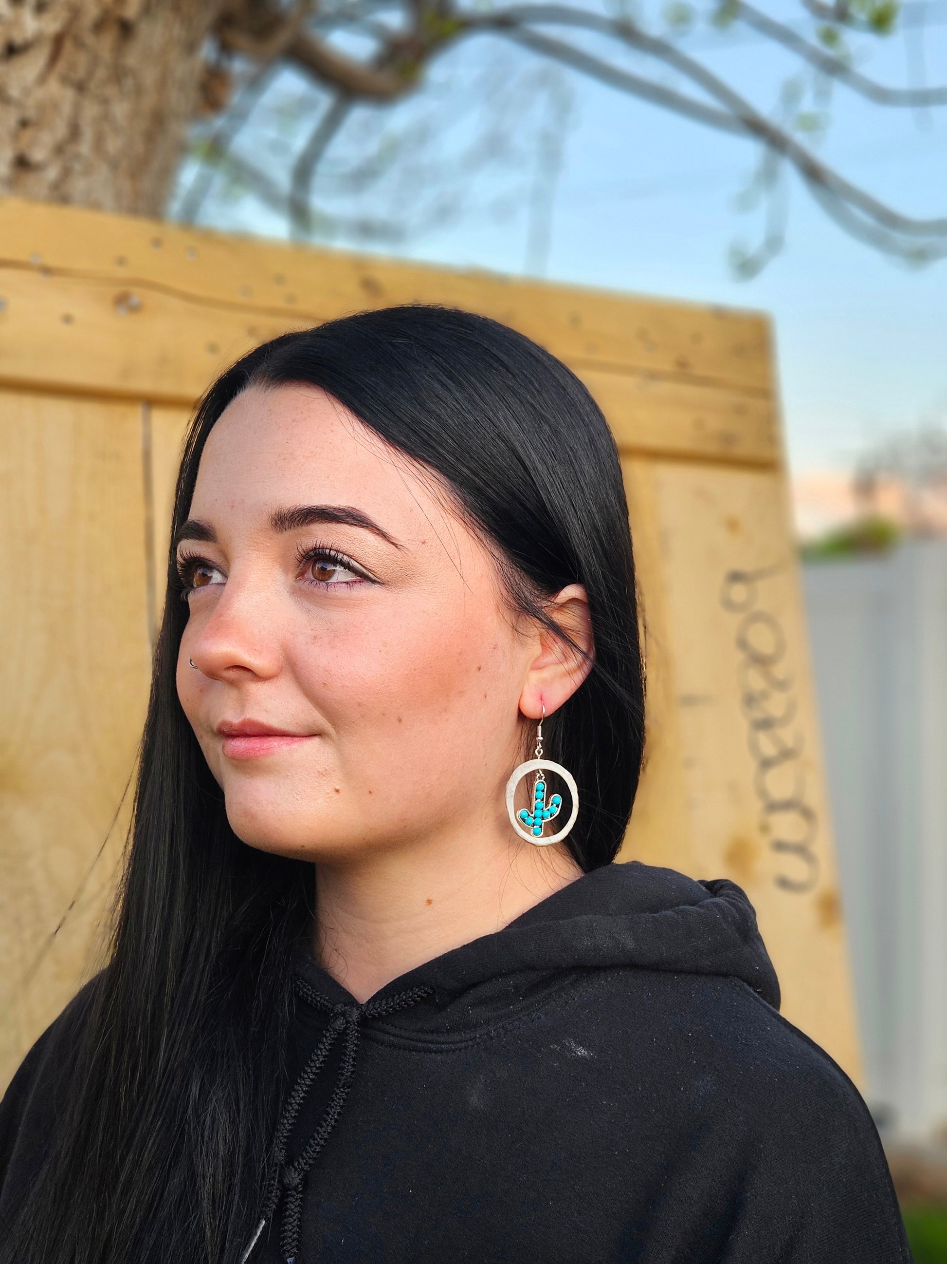 This style features a cactus shaped turquoise bead charm inside a hollowed out antler slice and comes with 925 hypo-allergenic hooks.