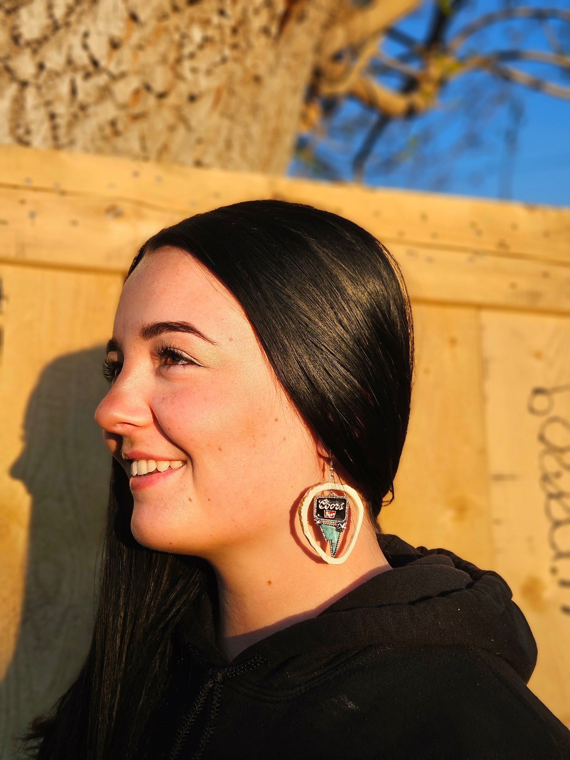 Beautiful and wild in one! This style features the Coors logo and a turquoise lightning bolt stone inside a hollowed antler slice and comes with 925 hypo-allergenic hooks.