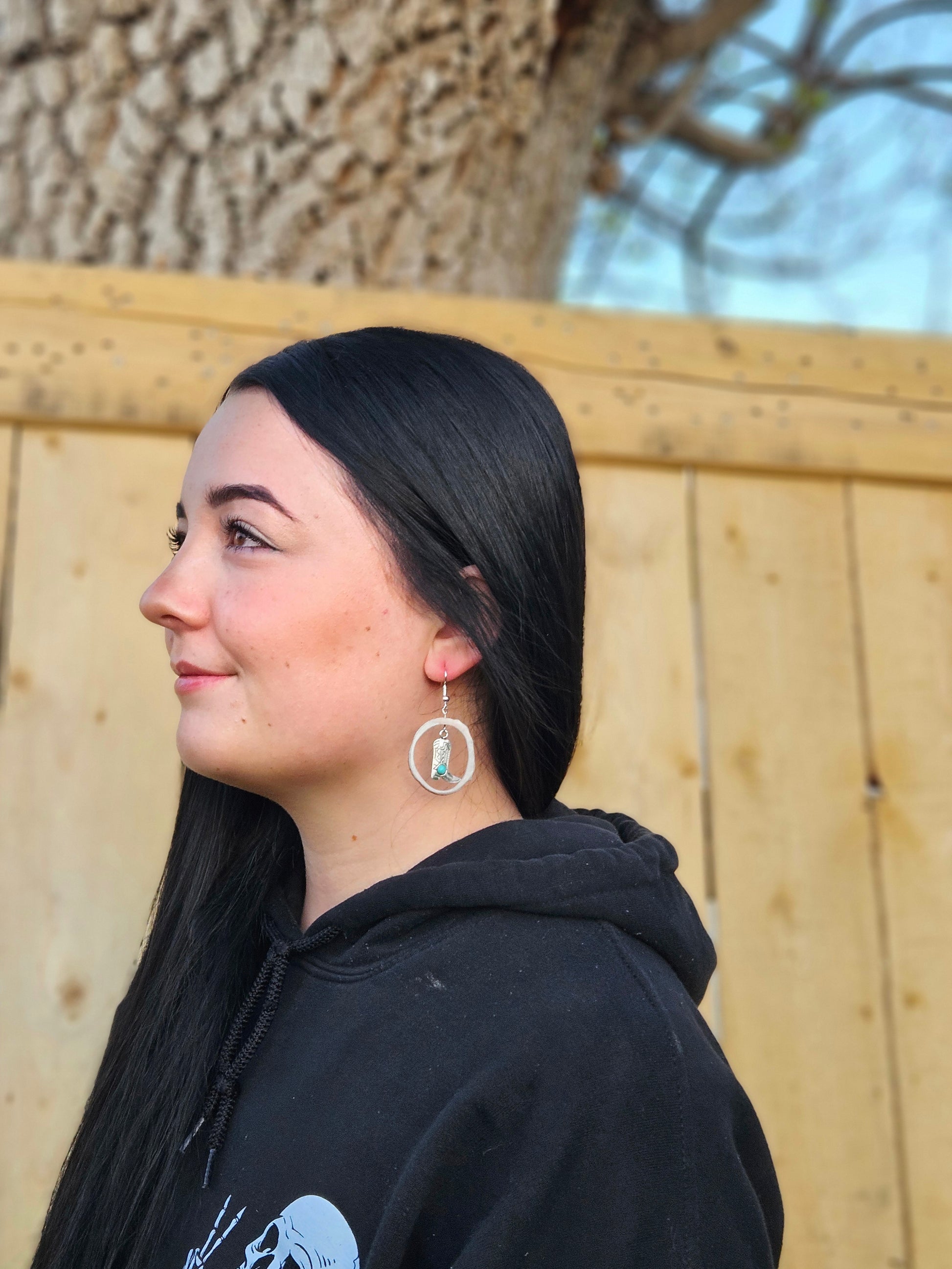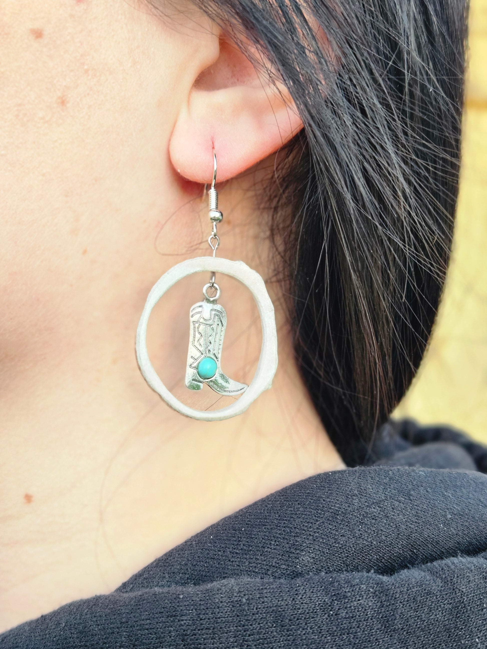 These boots are so fancy they can cut a rug. This style features a silver cowgirl boot charm and a touch of turquoise inside a hollowed out antler slice and comes with 925 hypo-allergenic hooks.