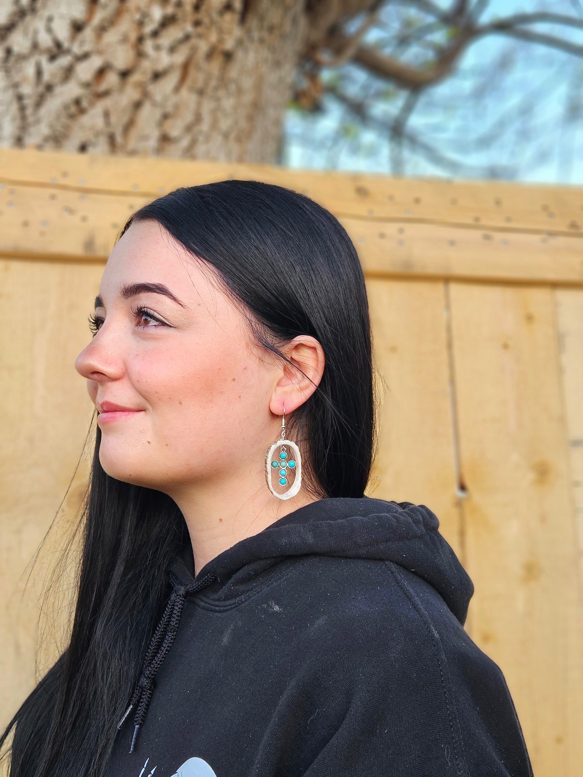 This style features a turquoise beaded cross charm inside a hollowed out antler slice and comes with 925 hypo-allergenic hooks