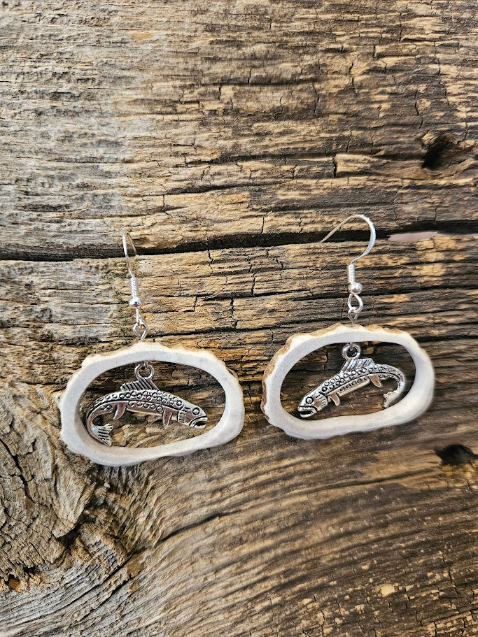 This style features horizontal hanging fish charms inside hollowed out antler slices with 925 silver hypo-allergenic hooks.