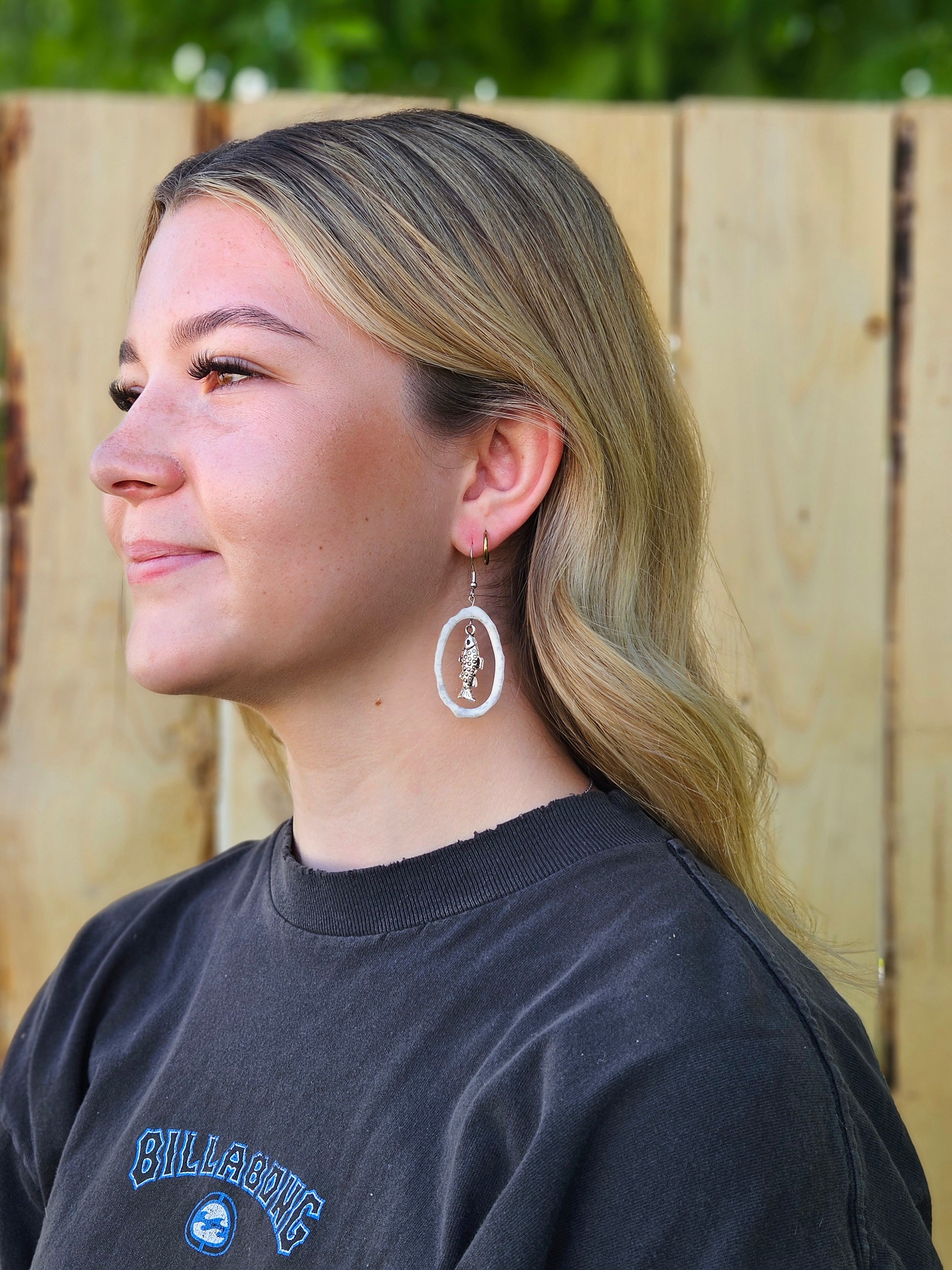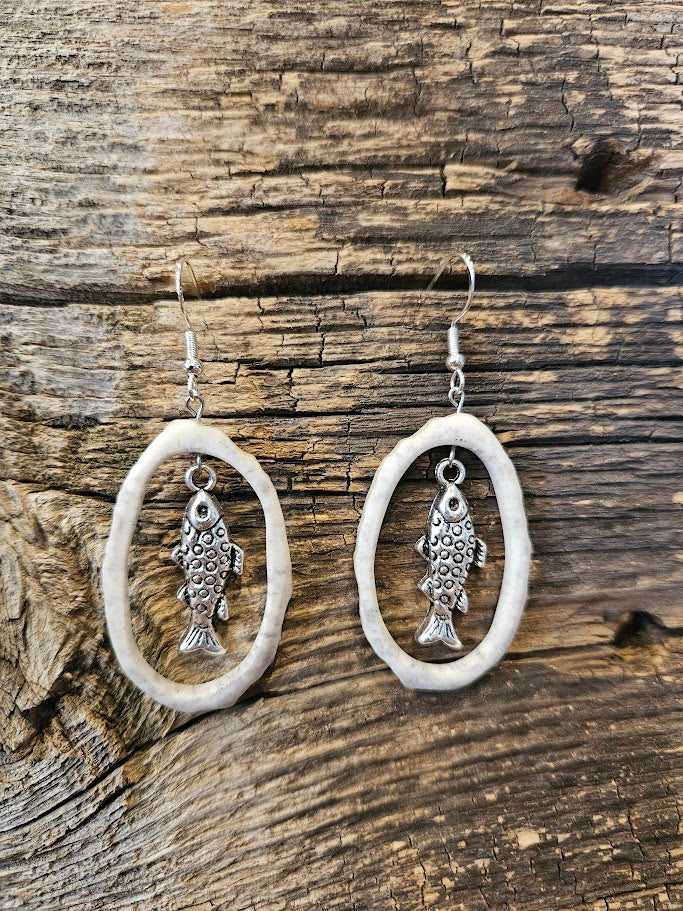This style features vertical hanging fish charms inside hollowed out antler slices with 925 silver hypo-allergenic hooks.