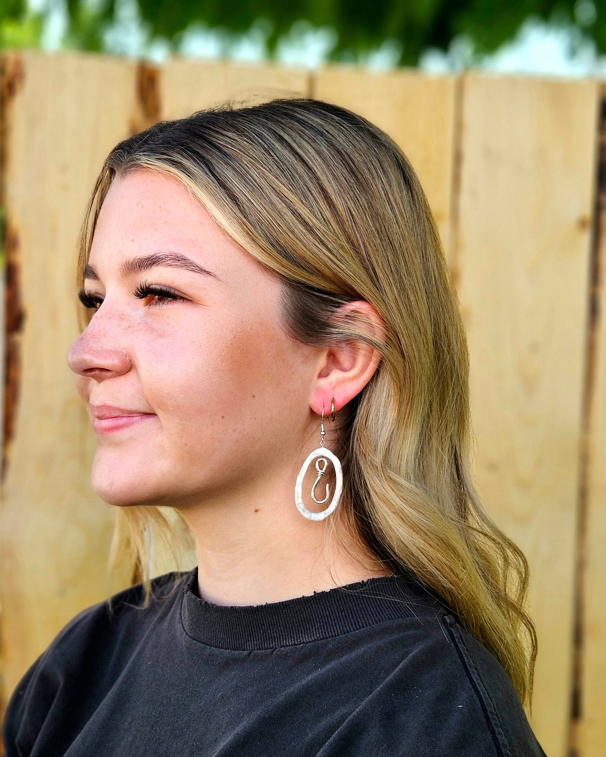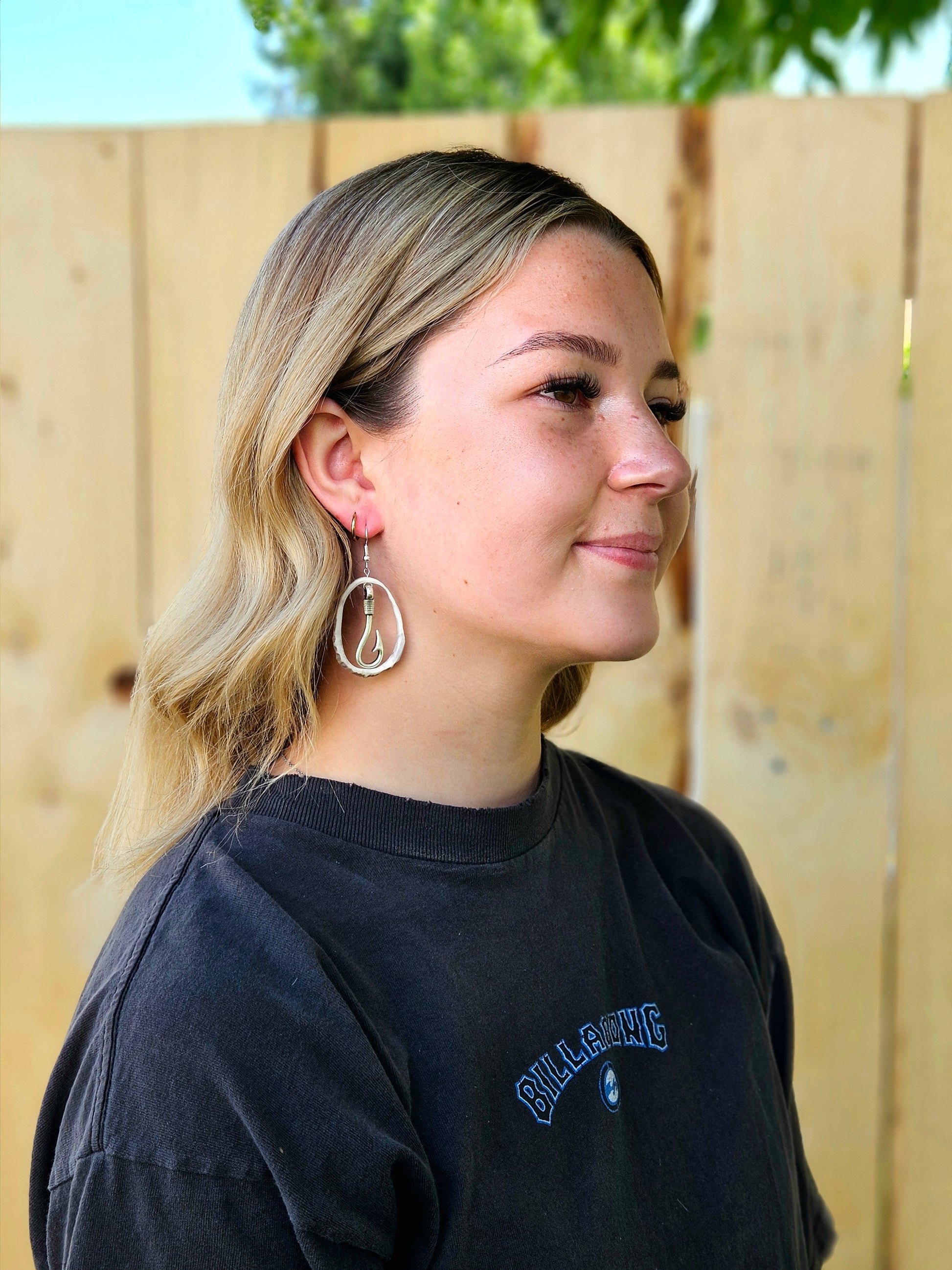 This style features small and large fishing hook charms inside hallowed out antler slices with 925 silver hypo-allergenic hooks.
