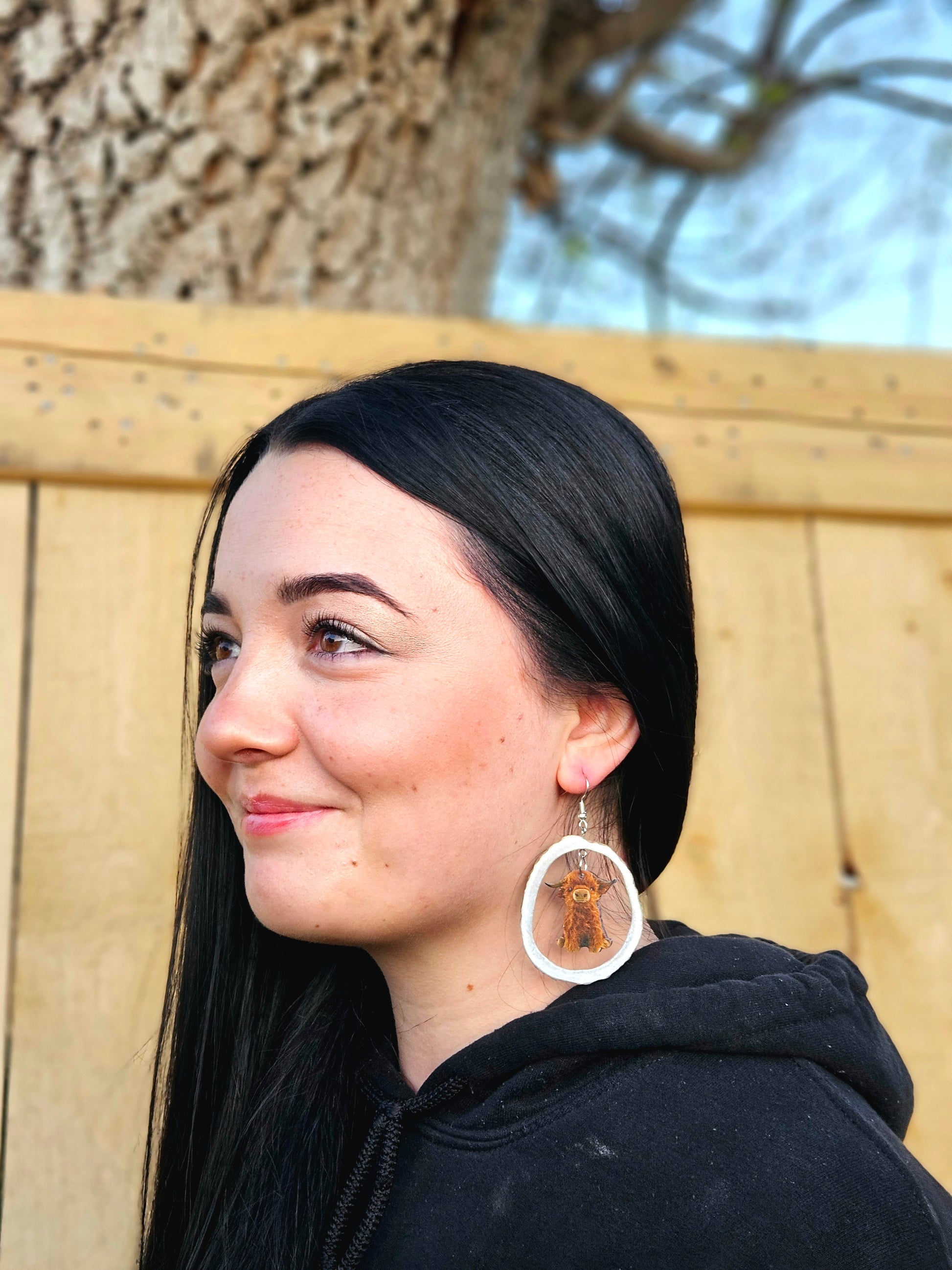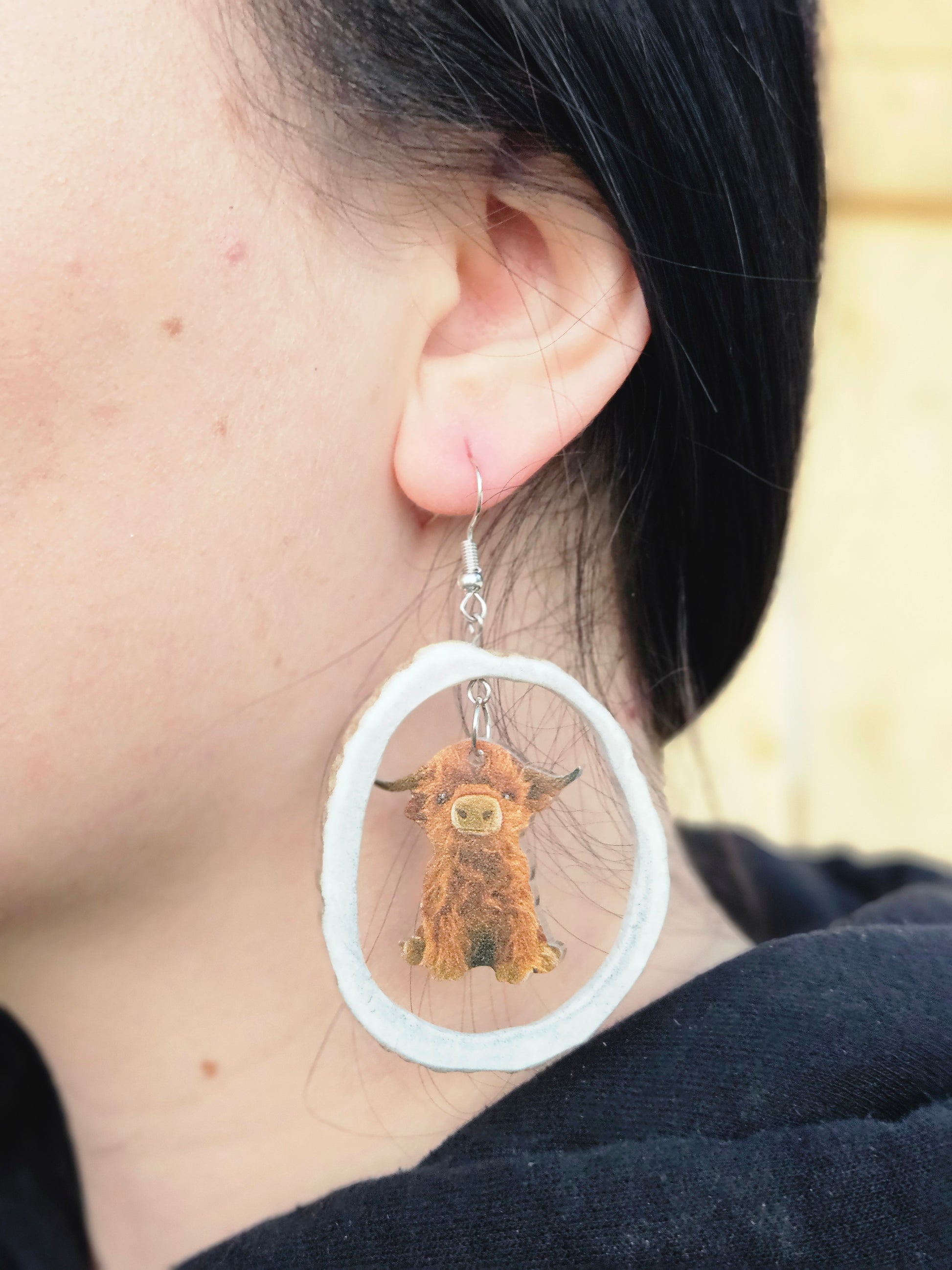 "Just look at how cute that cow is!"-everyone that sees you wearing these. This style features a highland cow charm inside a hollowed out antler slice and comes with 925 hypo-allergenic hooks.