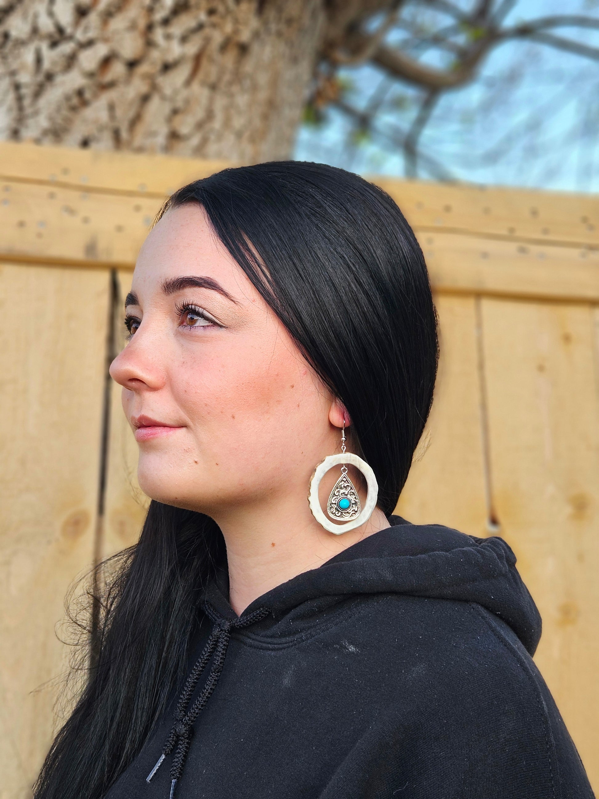 This style features a turquoise stone on a teardrop charm inside a hollowed out antler slice and comes with 925 hypo-allergenic hooks.