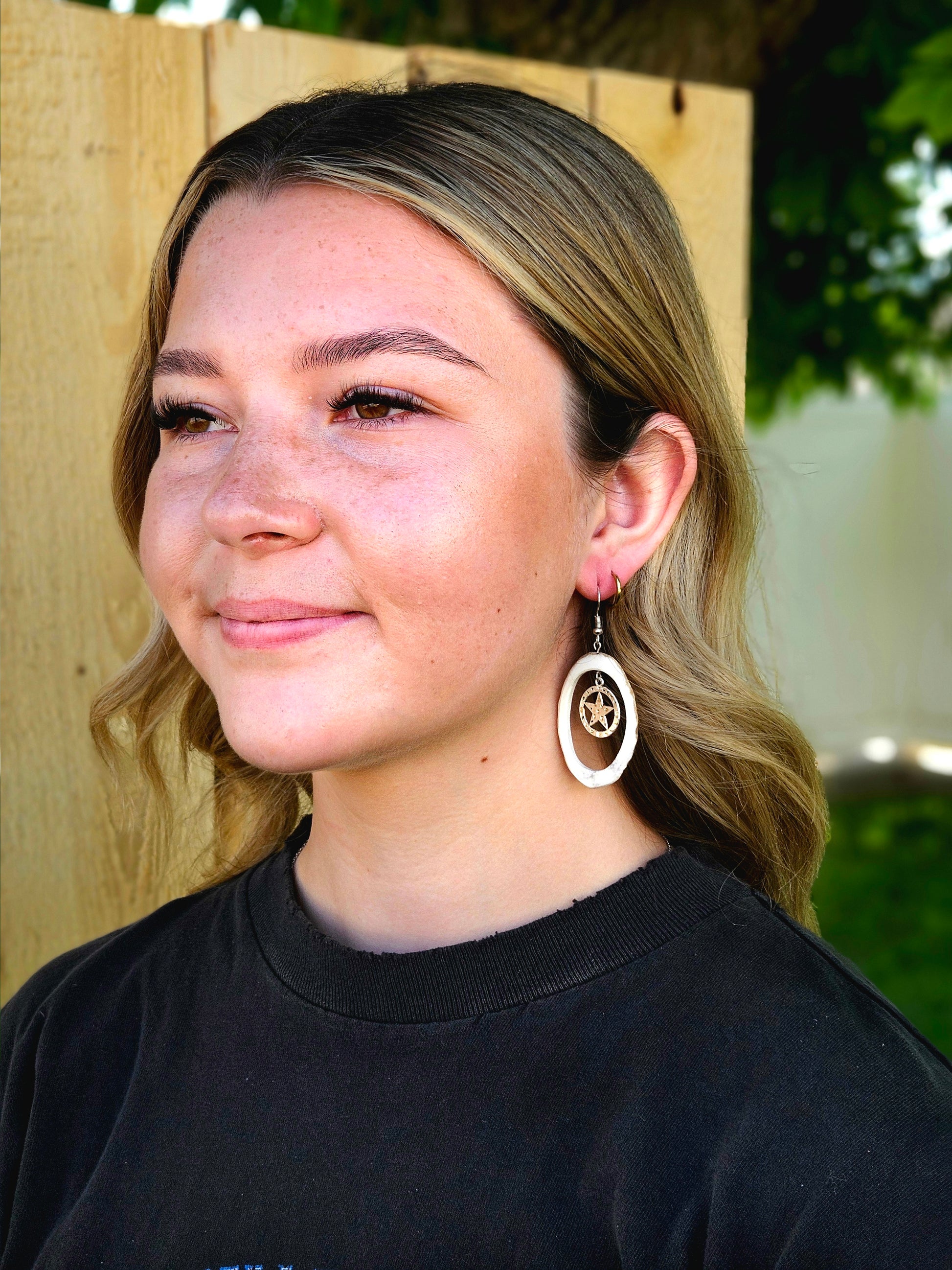 Silver hook only. Silver star hanging inside hallowed antler slice.