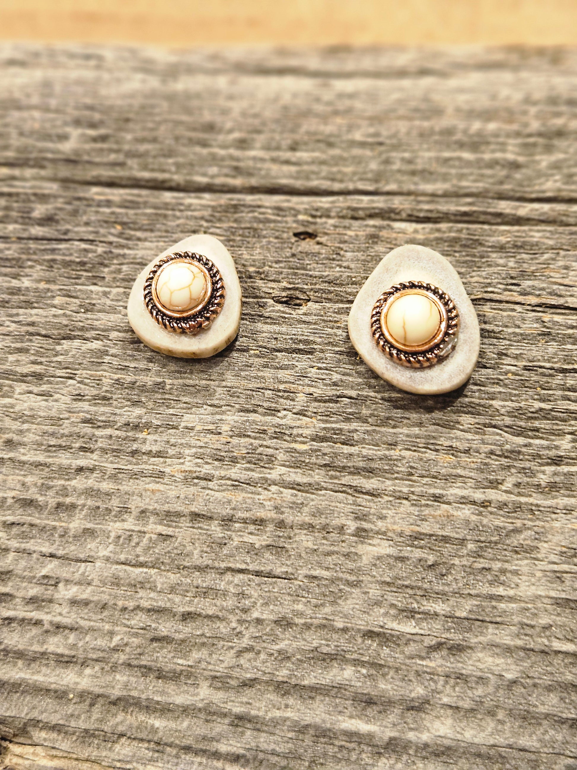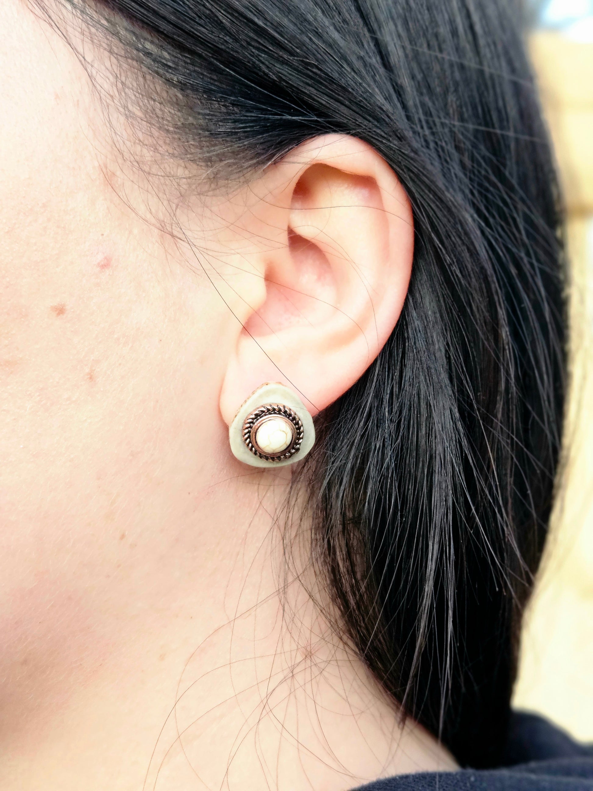 This stud style features a white buffalo stone surrounded by copper rope.